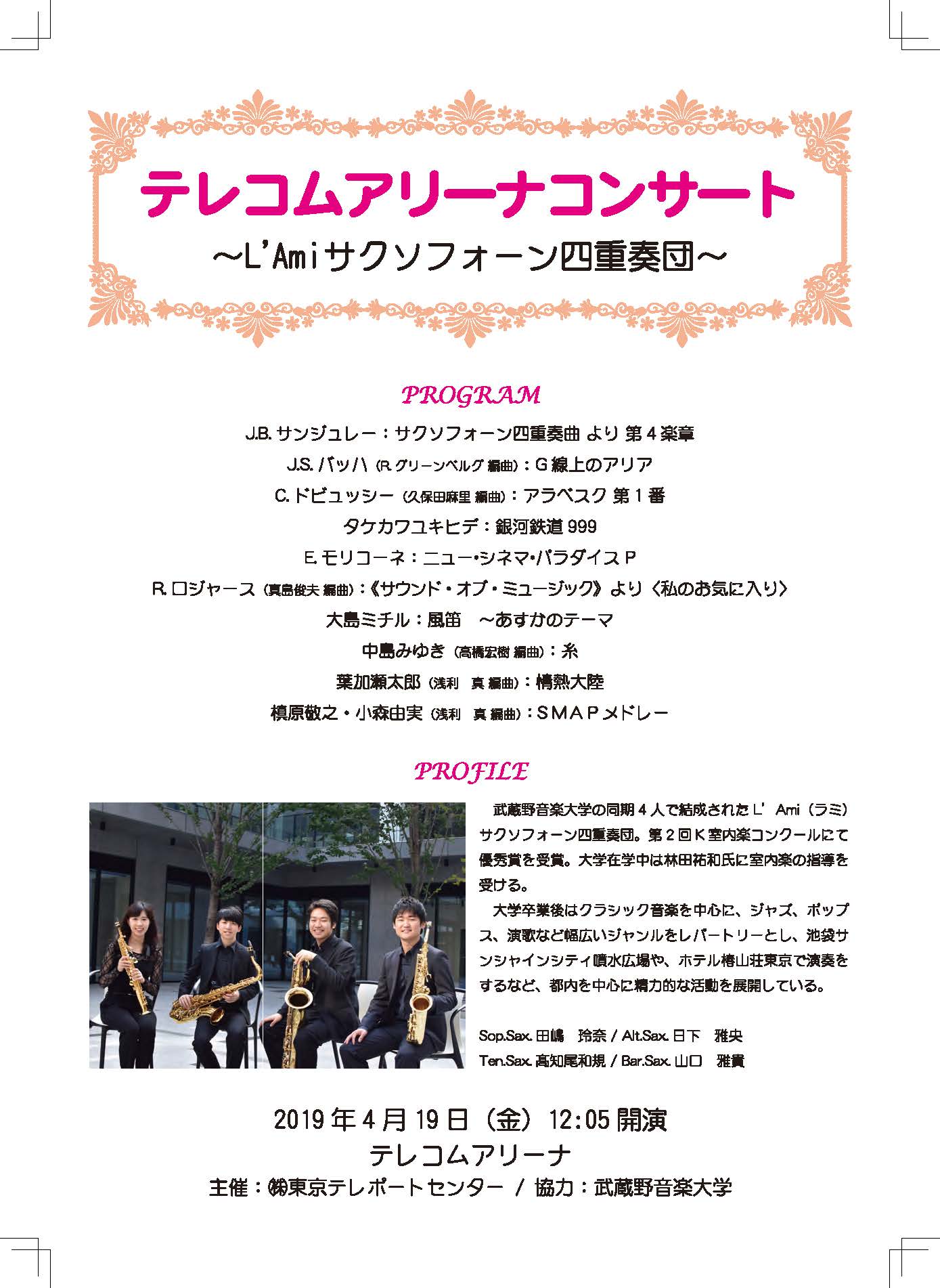 ☆テレコムアリーナコンサート ~L'Ami サクソフォーン四重奏団~ 開催のお知らせ☆ 4/19(金)12:05PM~